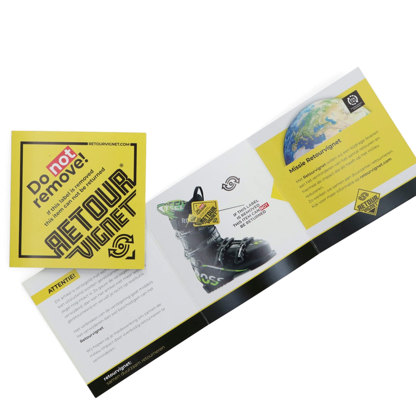 Bij een item voorzien van een Retourvignet-sticker of -verzegelaar dient een folder te worden bijgesloten om de koper nog meer bewust te maken van zijn handelen en oneigenlijk gebruik tegen te gaan. De folders is gedrukt op 100% duurzaam FSC-gekeurd papier.