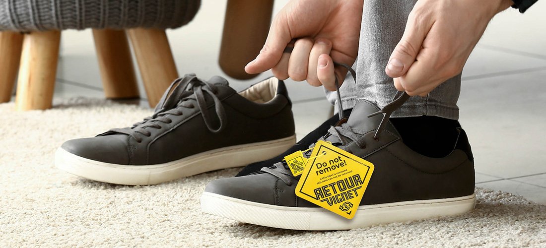 ‘Die razendsnelle afwaardering past niet een duurzame samenleving’, stelt Hilko Hooijer, een van de bedenkers van het Retourvignet. Als eigenaar van Hooijer Groep, distributeur van diverse schoenenmerken, is retourmisbruik voor hem een bekend probleem. ‘We wilden een betaalbare oplossing ontwikkelen waarbij de producent bij retour in één oogopslag zou kunnen zien dat het artikel gebruikt is. Maar een kledingstuk of een paar schoenen moet je wel gewoon thuis kunnen passen, dus dat was de grootste uitdaging.’